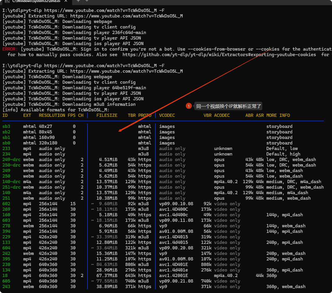 YouTube 视频有多种分辨率(如 360p、720p、1080p)。使用 -F 参数列出所有可用格式: