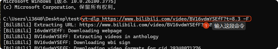 只需提供视频的 URL,yt-dlp 就会自动下载默认格式的视频。以下以 Windows 系统为例,展示如何下载 Bilibili 和 YouTube 视频。如果你使用方法 2,确保在 C:\yt-dlp 文件夹内打开命令提示符运行命令
