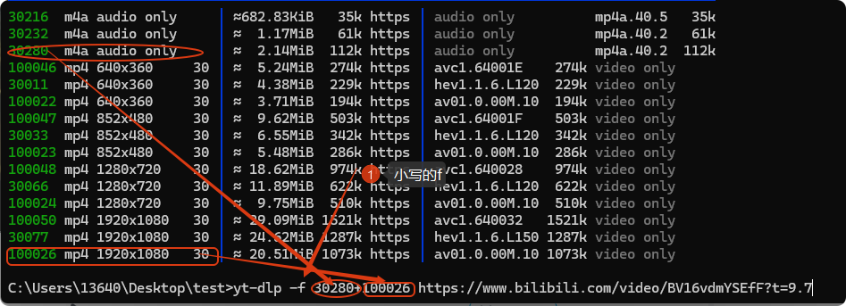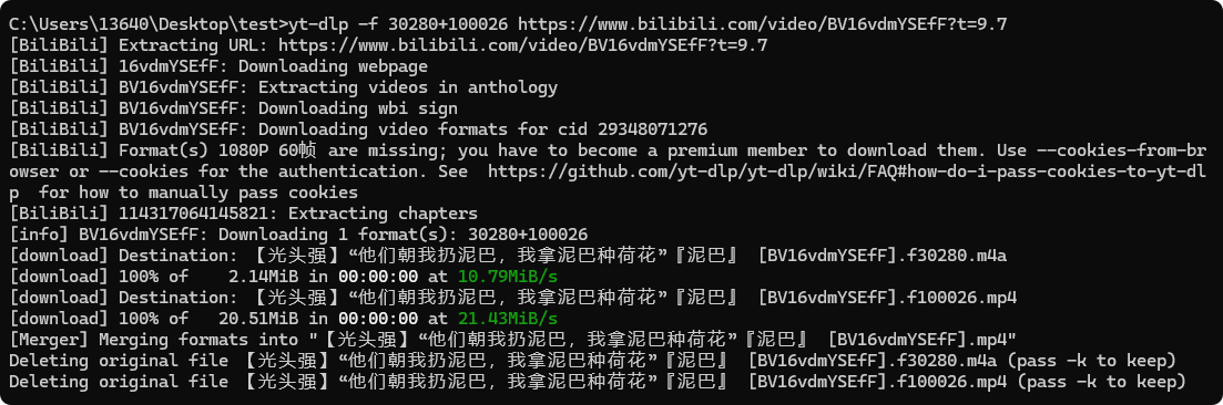 要选择特定视频和音频格式,例如 1080p 视频(ID 20280)+高品质音频(ID 100026),并合并音视频:
