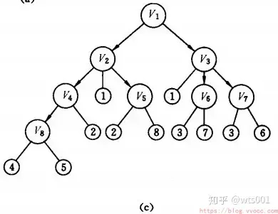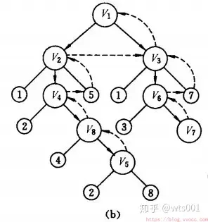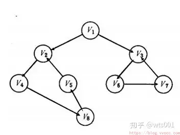 首先访问页面v1 和v1 的邻接点v2 和v3,然后依次访问v2 的邻接点v4 和v5 及v3 的邻接点v6 和v7,最后访问v4 的邻接点v8。由于这些顶点的邻接点均已被访问,并且图中所有顶点都被访问,由些完成了图的遍历。得到的顶点访问序列为: