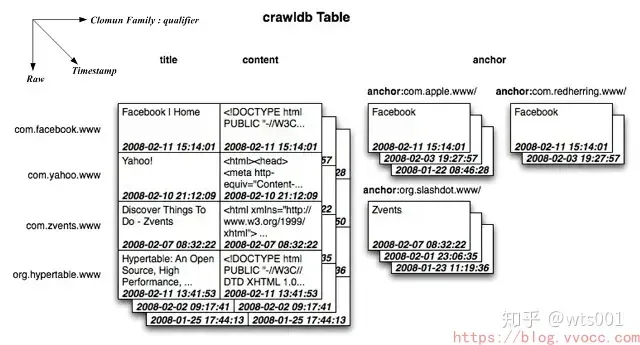 Column Family包括title、content、anchor,其中tile保存网页的标题,content保存网页html内容,anchor保存网页被其它网页引用的链接,qualifier就是其它网页的URL,内容为其它网页中该链接的页面显示字符,同样anchor链接的URL主机域字符串被反置。对于不同时间获取的同一网页的有关内容被打上不同的时间戳Timestampe,如图纵向座标可以看到不同的版本。