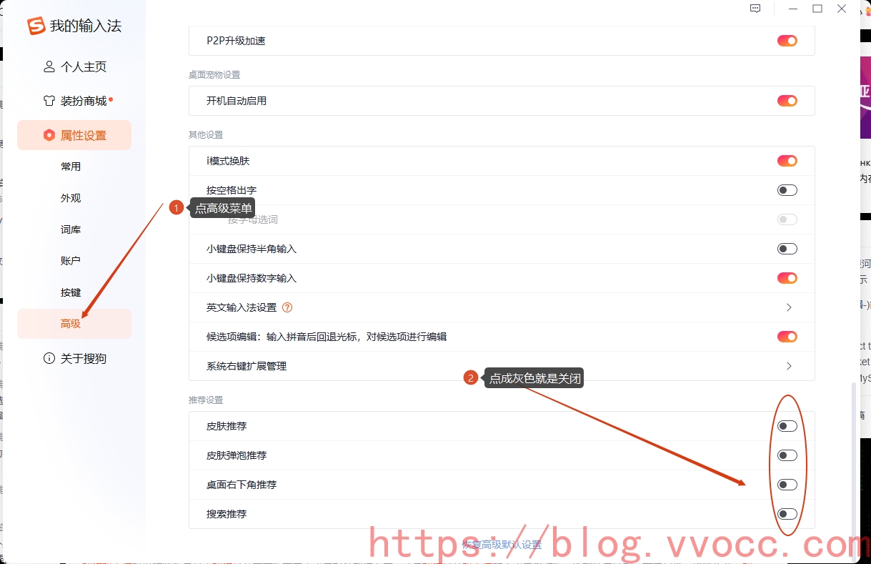 最新版本:点击输入法状态栏上的 S 图标→更多设置→高级→关闭 “桌面右下角推荐”