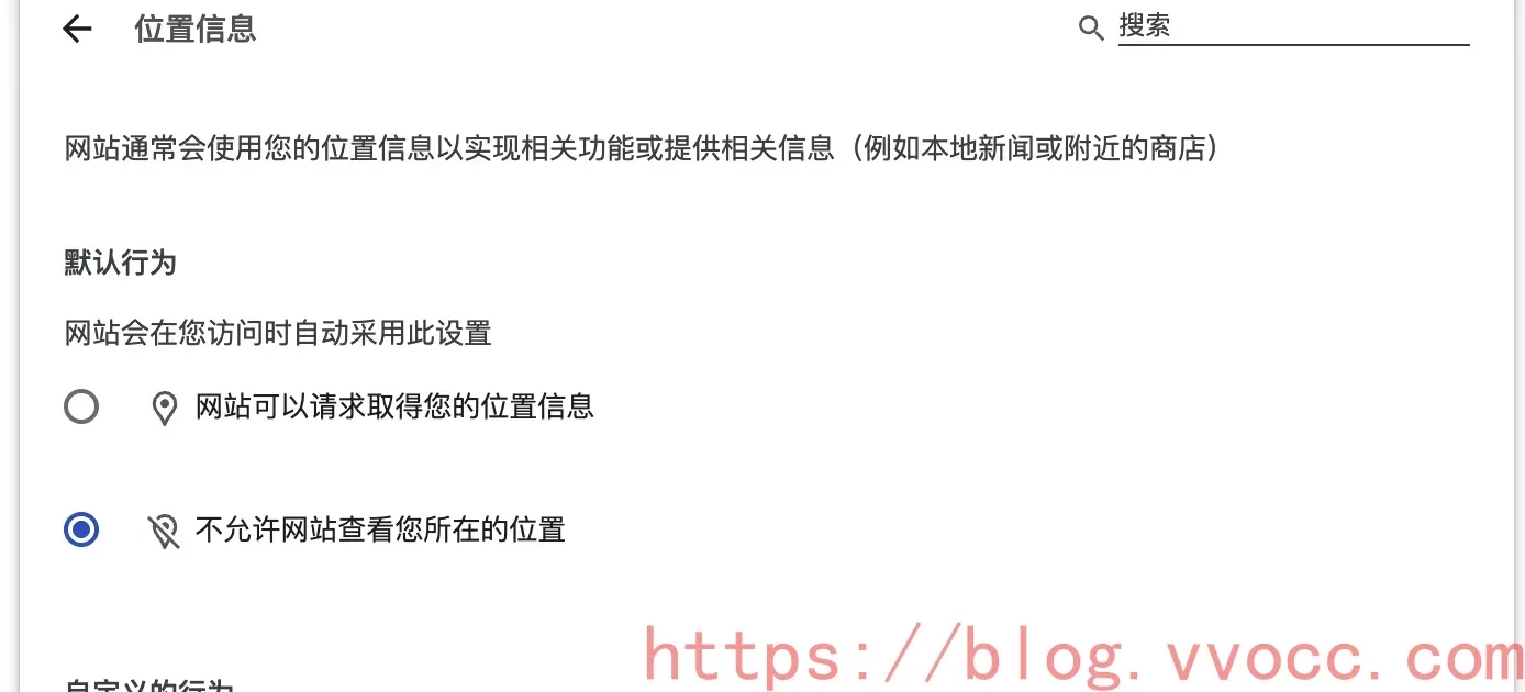 接下来我们使用 chrome 举例子, 更多的浏览器可以自行谷歌搜索怎么关闭, 以下是关闭所有网站的定位权限, 其实也可以仅仅关闭油管的定位权限.
